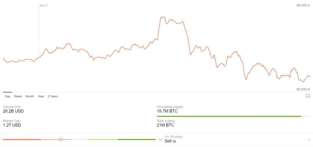 Inmitten dessen handelte Bitcoin zu einem Preis von 65.242,96 Dollar mit einem täglichen Anstieg von 2%. Die Königsmünze stieg von einem Tief von 63.840 Dollar auf ihr aktuelles Hoch. Dennoch blieb das tägliche Handelsvolumen des Vermögenswerts niedrig. Das 24-Stunden-Handelsvolumen von Bitcoin lag bei 19.157.703.865 Dollar mit einem Rückgang von 3%.